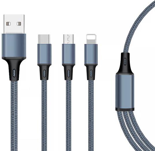 AHT DKS-31 Nylonszövet borítású, minőségi 3 in 1 töltőkábel USB Type C - USB Type C/mikro USB/Lightning