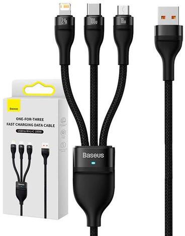 | Termék neve | Baseus Flash Series 3 az 1-ben USB-kábel, USB-C + micro USB + Lightning, 100W, 1.2m (fekete) |