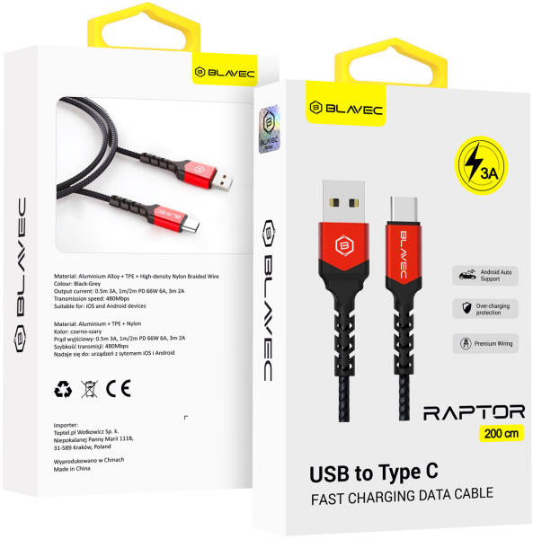 Blavec Kábel Raptor fonott - USB és Type C - 3A 2 méter Apple CarPlay/Android Auto (CRA-UC3BR20) fekete-piros,