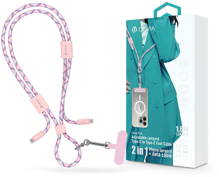 DEVIA Cable Pro5 Woven 60W PD Type-C/Type-C adat- és töltőkábel + nyakpánt 1.6m - pink