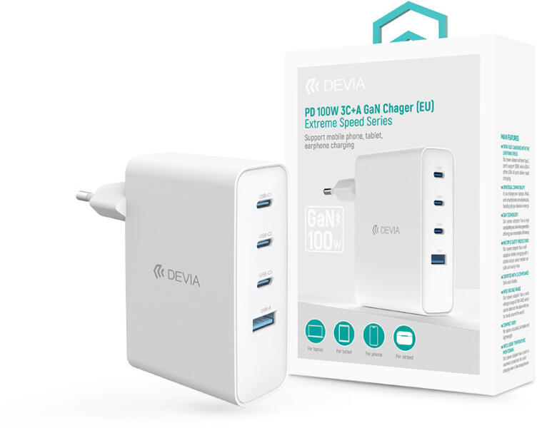 DEVIA Extreme Speed Series 100W GaN PD hálózati gyorstöltő adapter USB+3xType-C - fehér (ST121430) - mostelado