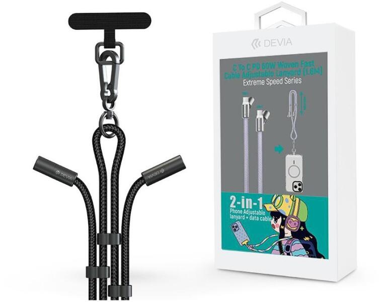 DEVIA Extreme Speed Series Woven 60W PD Type-C/Type-C adat- és töltőkábel + nyakpánt 1.6m - fekete - coolmobile
