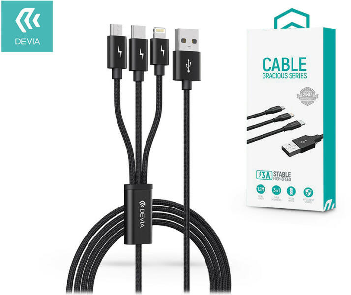 DEVIA Gracious Series 3in1 15W Lightning/microUSB/Type-C töltőkábel - 1, 2 m - fekete - nextelshop