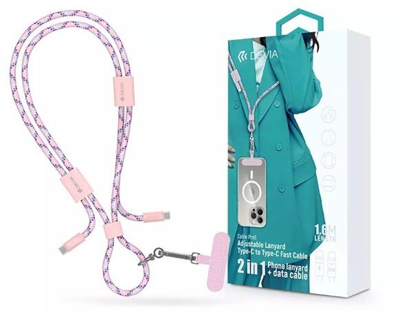 DEVIA ST124967 Cable Pro5 Woven 1, 6m 60W PD Type-C - Type-C pink adat- és töltőkábel + nyakpánt (ST124967) - pcx