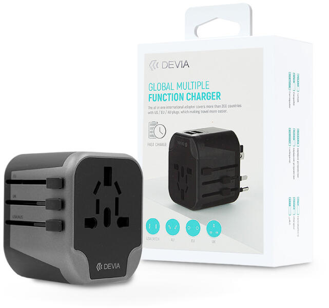 DEVIA többfunkciós globális hálózati töltő adapter (UK/EU/USA/USA/Japán/AU) - Devia Global Multiple Function Charger - fekete (ST330865)