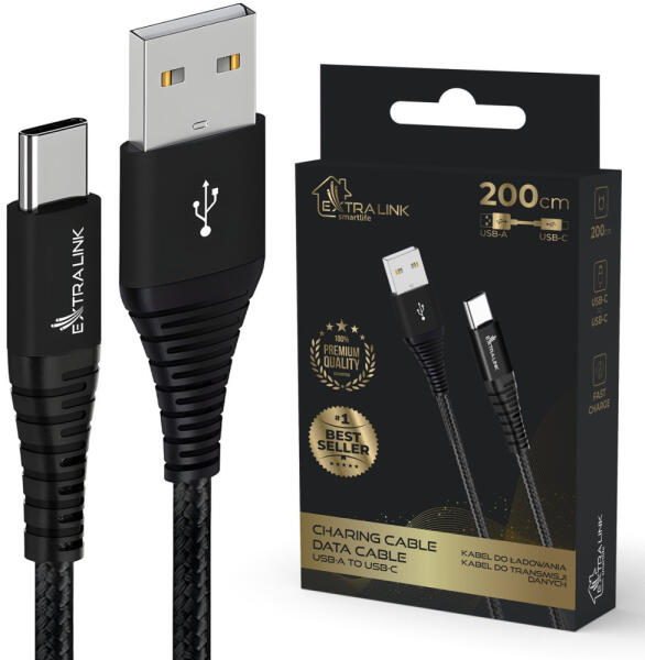Extralink Smart Life fonott 15W USB Type-A - Type-C kábel, 2m, fekete, USB kábel, 5V 3A (4bc039ef-f118-45bc-a546-558aa6938b55)