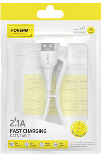 Foneng X77 Lightning Cable The Foneng X77 cable will allow you to charge your iPhone in just a few moments. The X77 is capable of charging at 2.1A. You can also use it to transfer files freely. The cable is made of robust plastic, which is characterised by high resistance to wear. Its end is additionally reinforced, making it resistant to repeated bending or pulling. ManufacturerFonengModelX77ColourWhit eOutput current5V / 2.1ALength1 m