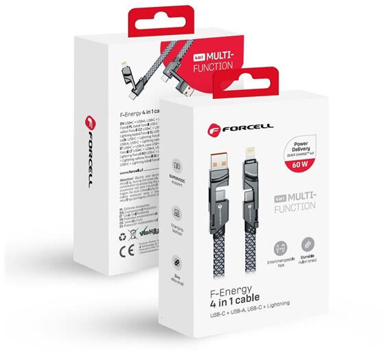 4 az 1-ben kábel A cserélhető csatlakozókkal ellátott innovatív kialakításának köszönhetően a Forcell kábel hatékony és sokoldalú töltést biztosít az eszközök széles skálájához. Akár USB-C, USB-A vagy Lightning csatlakozót használnak az eszközei, ez a kábel garantálja a teljes kompatibilitást. Tartós és rugalmas A robusztus nejlonfonat növeli a kábel szilárdságát és rugalmasságát, így ellenáll a kopásnak és a mechanikai sérüléseknek. Emellett a horganyzott ház fokozza a termék esztétikumát és korrózióállóságát. Gyors töltés támogatása A Quick Charge 4.0, a SUPERVOOC és a Power Delivery támogatása lehetővé teszi, hogy gyorsan és hatékonyan töltse készülékeit. A kábel biztonságos és azonnali feltöltést biztosít, minimálisra csökkentve a töltési időt. Laptopokat is feltölti Nélkülözhetetlen utazáskor, munkahelyen és otthon. Nagy, 60 W-os töltőteljesítményének köszönhetően nemcsak az okostelefonok, hanem az energiaigényesebb eszközök, például laptopok kényelmes és gyors feltöltését is lehetővé teszi. Biztonsági funkciók A beépített biztonsági funkciók garantálják a rövidzárlatok és feszültségcsúcsok elleni védelmet az árammal ellátott eszközökben. A termék CE és RoHS tanúsítvánnyal is rendelkezik. Specifikáció:Anyag: nejlonból fonott kábel, galvanizálással ellátott cinkötvözet ház Támogatja a gyorstöltési szabványokat: Gyorstöltés 4.0, SUPERVOOC és Power Delivery: Quick Charge 4.0, SUPERVOOC és Power Delivery.