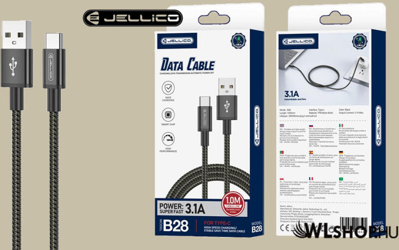 Jellico USB-A/USB-C adat/töltőkábel 3.1A 1m Jellico B28 - Fekete (B28-01)