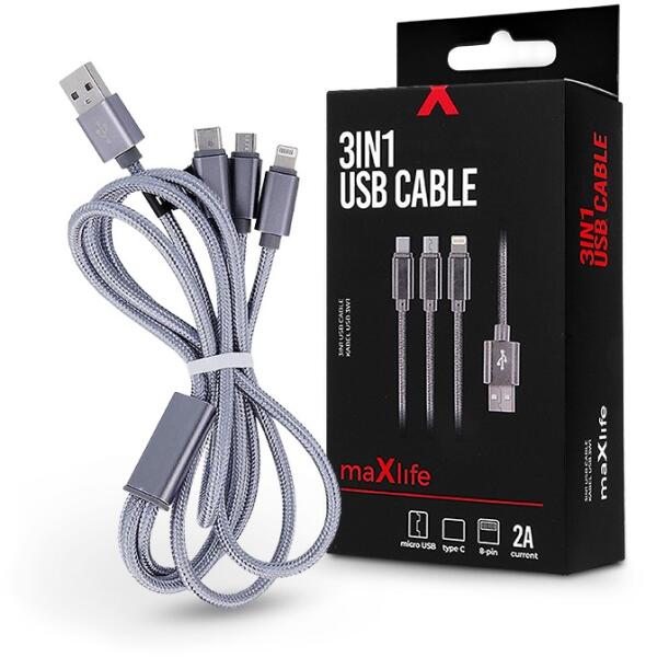 Maxlife 3 in 1 10W Lightning/microUSB/Type-C USB Cable töltő- és adatkábel 1m - ezüst - nextelshop