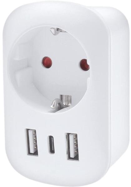 Utazóadapter földeléssel és beépített USB-töltővel, max. 13A.
