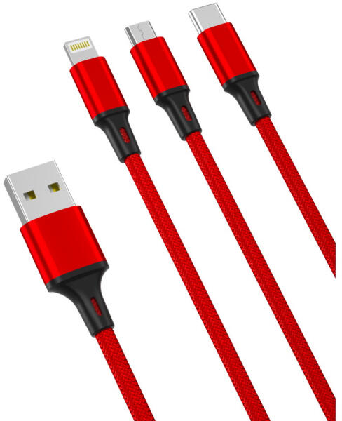 XO NB173 USB Cable 3in1 Micro-USB, Type-C, Lightning kábel, 2.4A, 1.2m, piros